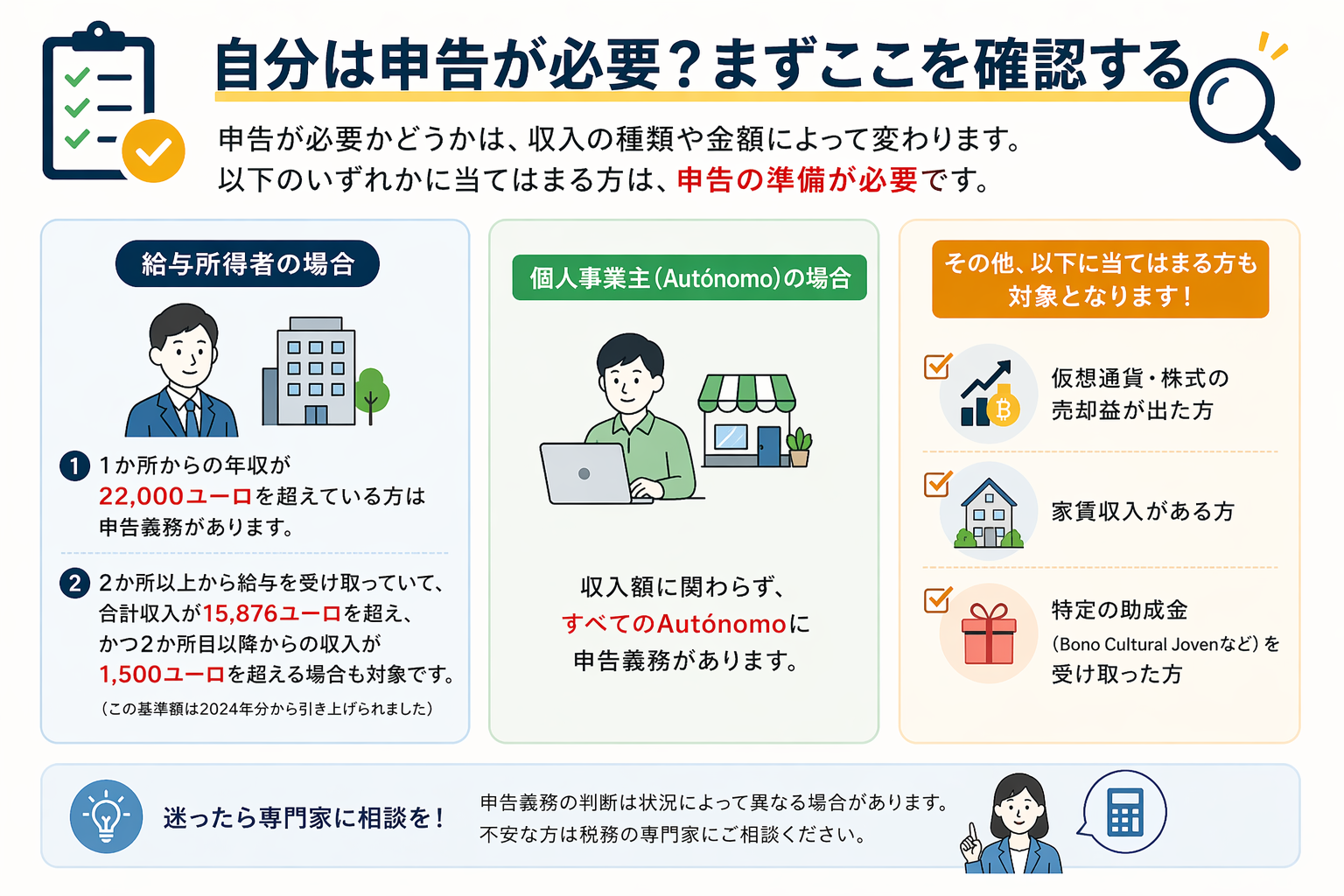 給与所得者の場合→ 1か所からの年収が22,000ユーロを超えている方は申告義務があります。また、2か所以上から給与を受け取っていて、合計収入が15,876ユーロを超え、かつ2か所目以降からの収入が1,500ユーロを超える場合も対象です(この基準額は2024年分から引き上げられました)。