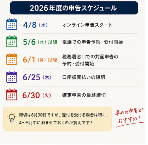 締切は6月30日ですが、6月になると申告が集中して税務署対応も混み合います。還付を受ける場合は特に、4〜5月中に済ませておくのが賢明です。